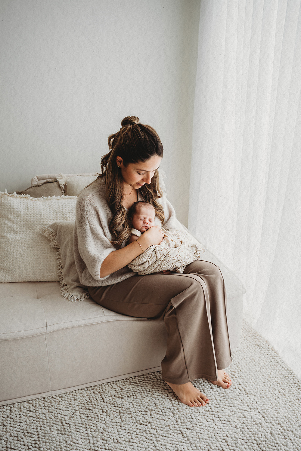 Ik ben Stephanie, fotograaf in Limburg en omstreken. Mijn stijl is rustig, licht en eenvoudig, zodat de aandacht vanzelf gaat naar jullie en jullie kindje. Geen ingewikkelde poses, gewoon een ontspannen setting waarin alles op zijn plek valt. In mijn daglichtstudio werk ik met een minimalistische basis, zachte tinten en vooral veel wit. Dat creëert ruimte en rust en zorgt ervoor dat de beelden tijdloos blijven. Jullie mogen gebruik maken van mijn client closet, die volledig aansluit op deze stijl.