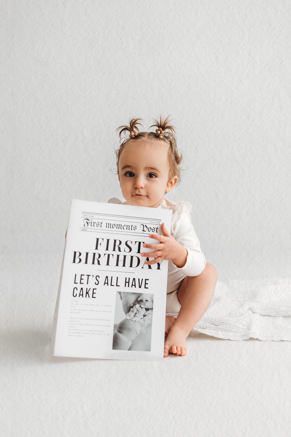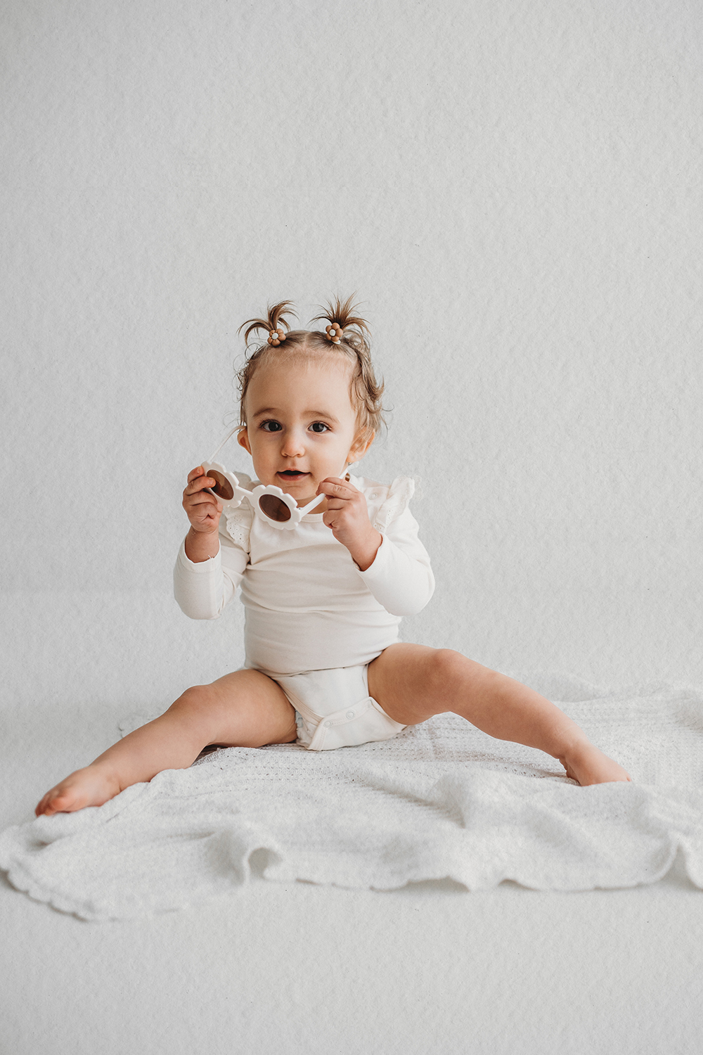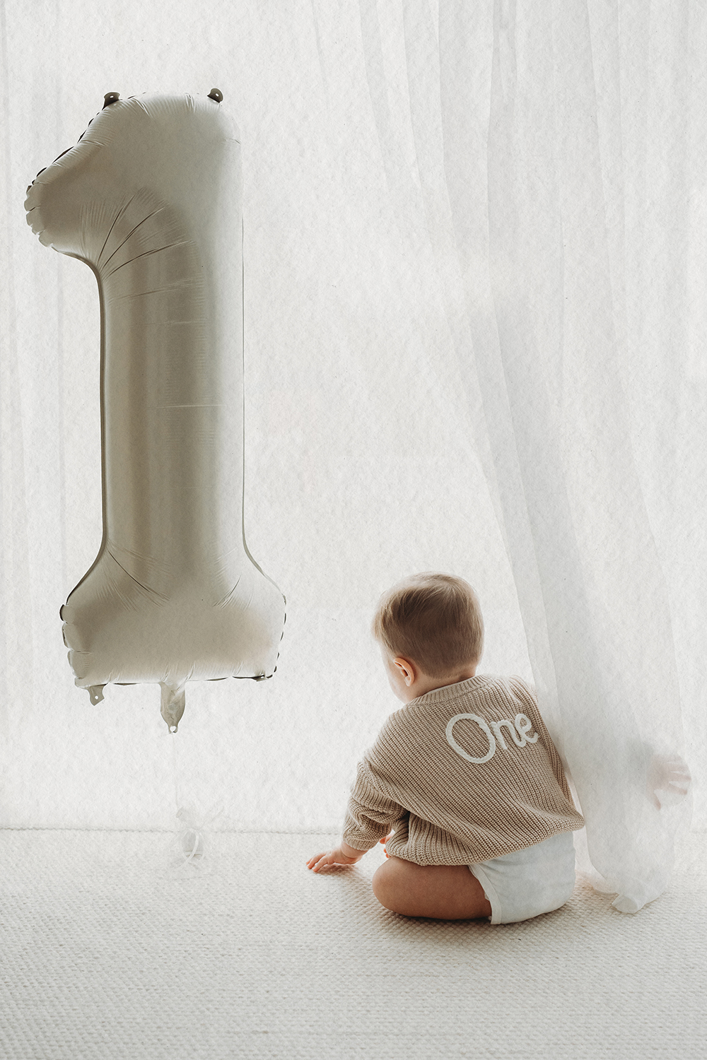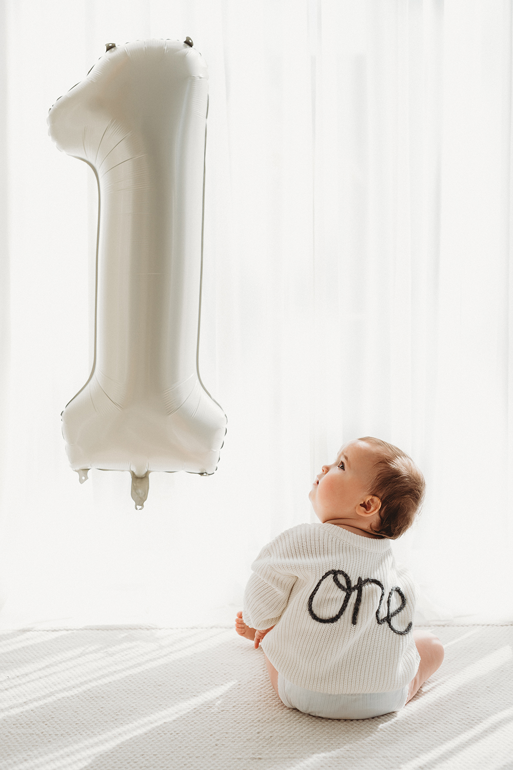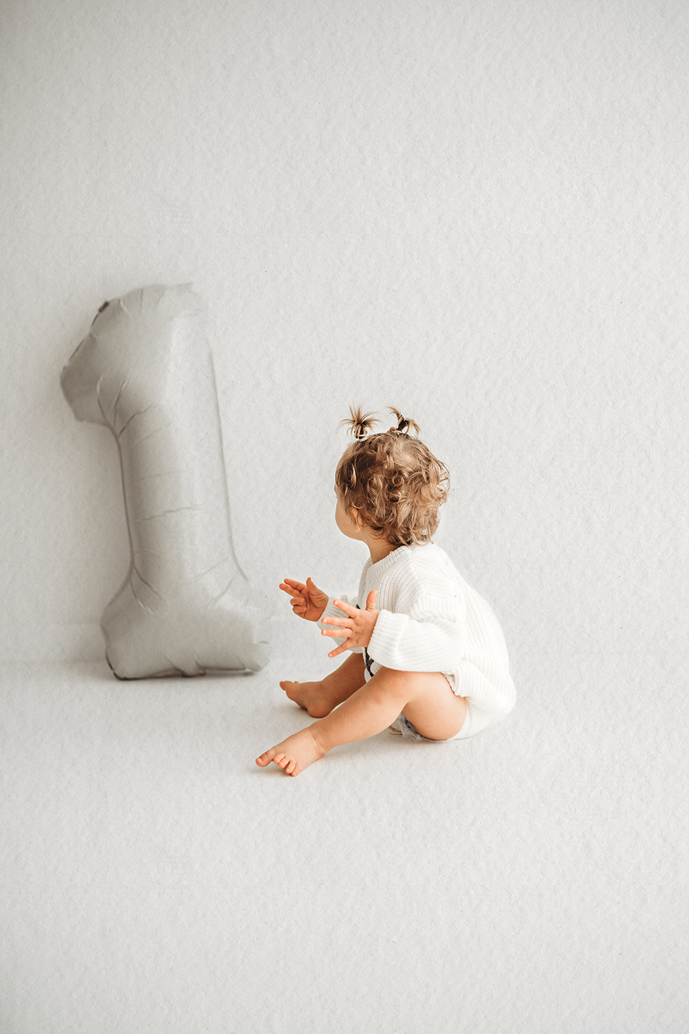 Tijdens de shoot volg ik het ritme van jullie kindje. Sommige kindjes lachen meteen, andere hebben even wat tijd nodig om te wennen, alles mag. De One Year shoot is ideaal vlak voor de eerste verjaardag. Meestal plannen we deze shoot rond de 11 maanden.